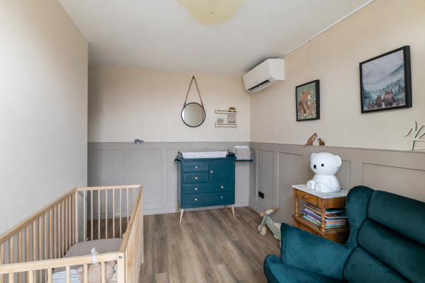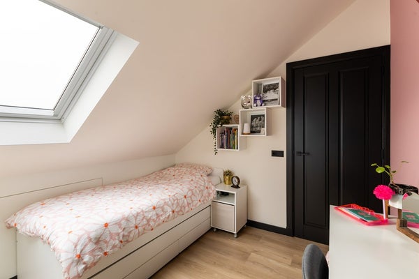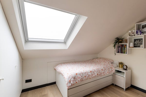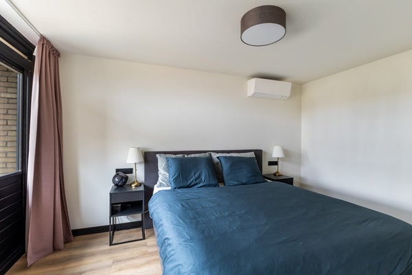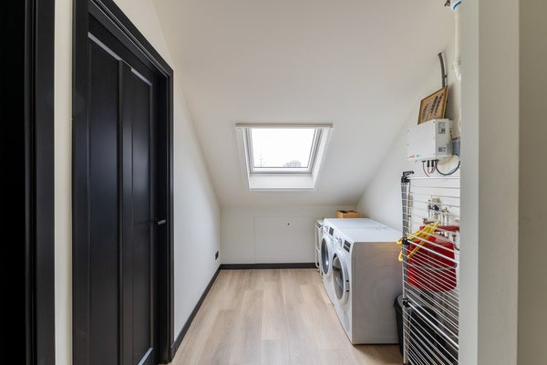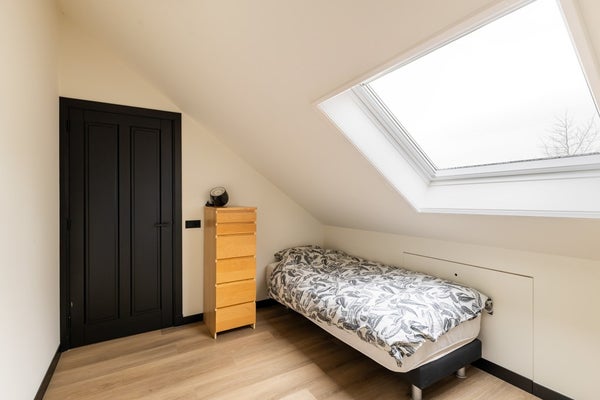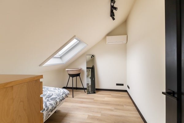 Via een vaste trap is de overloop op de tweede verdieping bereikbaar. Deze overloop geeft toegang tot twee slaapkamers en is voorzien van een Velux dakraam, wat zorgt voor prettig daglicht. Hier bevinden zich tevens de aansluitingen voor de wasmachine en droger, de cv-installatie (Intergas), de MV-box, de omvormer van de 10 zonnepanelen en een ruime berging. Achter de knieschotten is tevens bergruimte aanwezig. Beide slaapkamers zijn keurig afgewerkt en beschikken elk over een airconditioning en een groot Velux dakraam met verduistering.