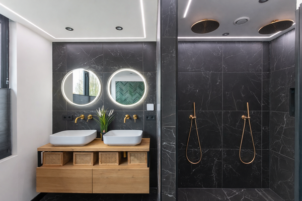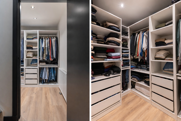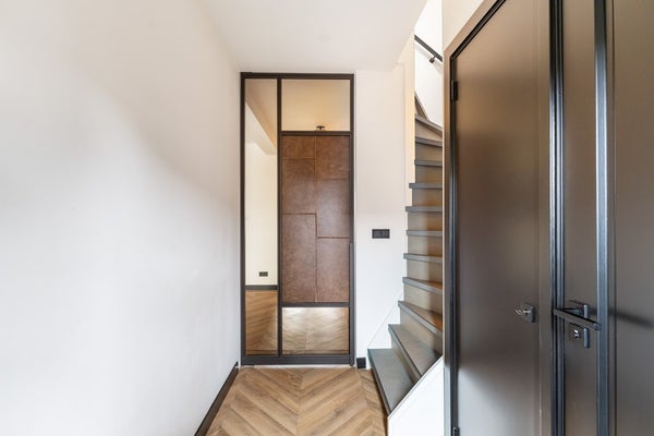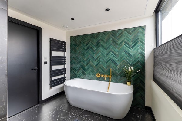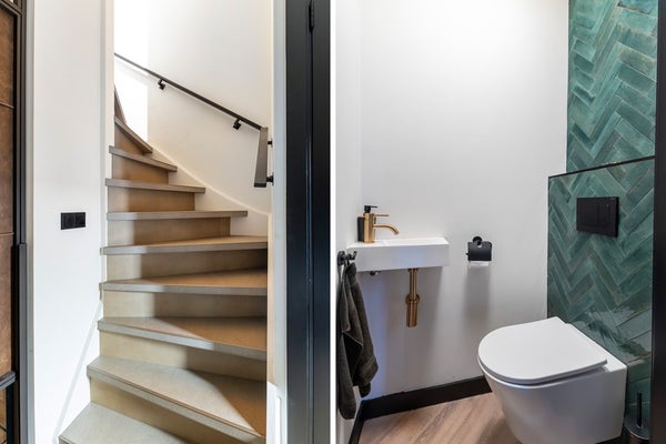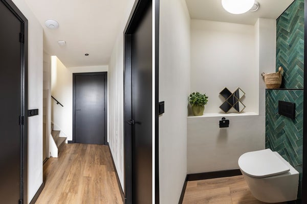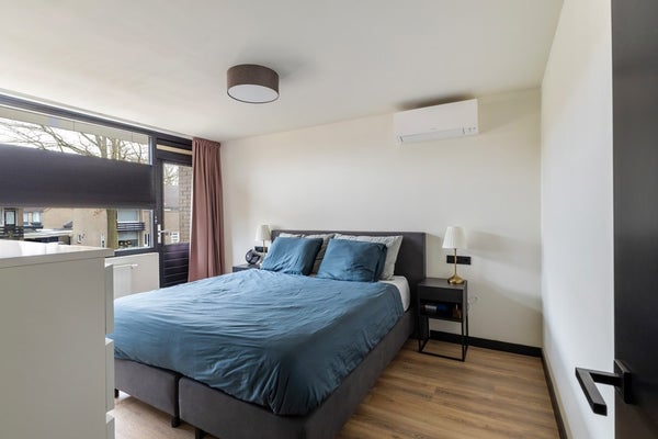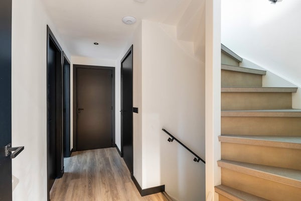 Via de strak afgewerkte trap met stalen trapleuning bereik je de overloop van de eerste verdieping. Deze geeft toegang tot twee slaapkamers, een praktische inloopkast, een separate toiletruimte en de badkamer. De ruime, luxe badkamer is voorzien van vloerverwarming en beschikt over een heerlijk halfvrijstaand ligbad, een dubbel wastafelmeubel, designradiator en een dubbele regendouche. De afwerking is hoogwaardig, met inbouwspots en sfeervolle ledstripverlichting. Beide slaapkamers op deze verdieping, één aan de voorzijde en één aan de achterzijde, zijn keurig afgewerkt met strakke wanden en plafonds en zijn beide uitgerust met airconditioning. De ouderslaapkamer aan de voorzijde heeft bovendien toegang tot het balkon.