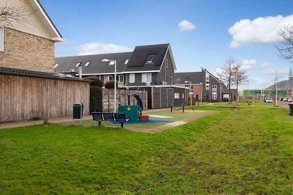 De achtertuin, gesitueerd op het zuiden, is keurig aangelegd met een terras inclusief zonnescherm, een gazon en een groene border. Achterin de tuin bevindt zich een sfeervolle houten veranda, evenals een houten berging met elektra, ideaal voor het opbergen van fietsen en tuingereedschap. Dankzij de verschillende zitplekken, zowel in de zon als overdekt, kun je op elk moment van de dag volop van het buitenleven genieten. Rondom de woning en in de wijk zijn bovendien voldoende parkeerplaatsen en speelvoorzieningen aanwezig, wat deze locatie bijzonder geschikt maakt voor gezinnen.