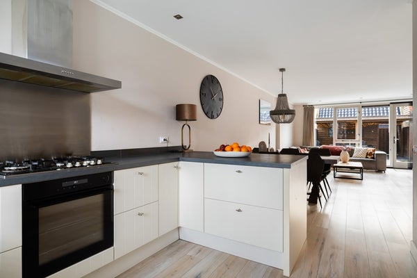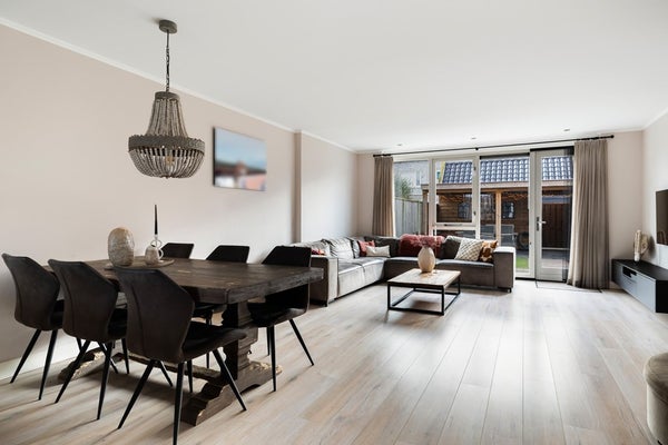 Bij binnenkomst in de woning kom je in de hal, die toegang geeft tot de meterkast (met glasvezelaansluiting), een modern afgewerkte toiletruimte met wandcloset en fonteintje, de trap naar de 1e verdieping en de woonkamer. De uitgebouwde, tuingerichte woonkamer is licht en ruim dankzij het grote raam en de loopdeur naar de achtertuin, die een mooie verbinding met buiten creëren. Aan de voorzijde van de woning bevindt zich de open keuken met een U-opstelling, waardoor er ruimte is voor een gezellige bar. De keuken is volledig uitgerust met inbouwapparatuur, waaronder een 5-pitsgaskookplaat, afzuigkap, oven, koelkast, vriezer en een vaatwasser (2023). De gehele begane grond is afgewerkt met een laminaatvloer met vloerverwarming en moderne houten stompe deuren. Daarnaast is er een praktische provisieruimte aanwezig voor extra opbergruimte.