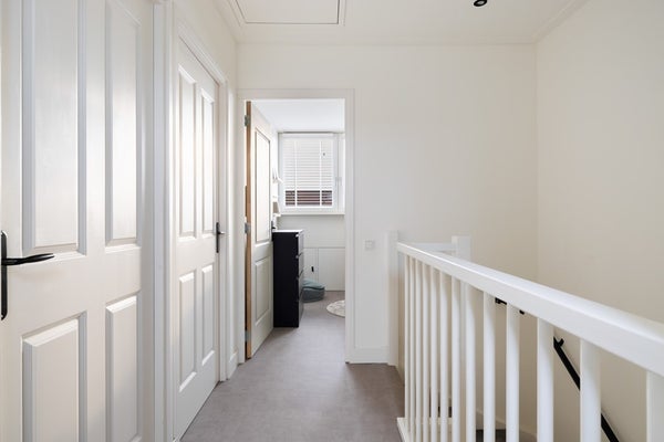 Op de eerste verdieping geeft de overloop toegang tot drie slaapkamers en een moderne badkamer. De badkamer, gelegen aan de voorzijde van de woning, is strak betegeld en voorzien van vloerverwarming, een ligbad (Whirlpool), douche, wastafelmeubel en een wandcloset. Direct naast de badkamer bevindt zich een ruime en keurig afgewerkte (ouder)slaapkamer met vaste (schuif)kastenwand. Aan de achterzijde zijn de andere twee slaapkamers gesitueerd. Alle kamers zijn afgewerkt met vloerbedekking en beschikken over grote raampartijen, waardoor ze heerlijk licht en comfortabel aanvoelen.
