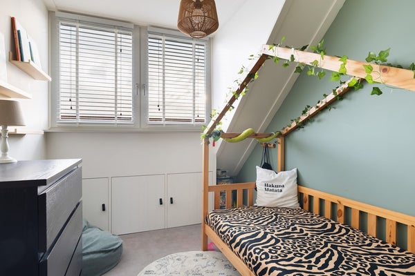 Met een vaste trap is de tweede verdieping bereikbaar, waar een ruime zolder is gerealiseerd. Door het plaatsen van een dakkapel met ingebouwde screens (2019) aan de achterzijde zijn er op deze verdieping maar liefst drie slaapkamers ontstaan: twee aan de achterzijde met dakkapel en één aan de voorzijde voorzien van een Velux dakraam. Op de overloop, eveneens met Velux dakraam, zijn de aansluitingen voor de wasmachine en droger te vinden, evenals de cv-installatie (Nefit, 2017) en de mechanische ventilatie-unit. Onder de schuine kanten van het dak en op de vliering (bereikbaar middels vlizotrap) is bovendien bergruimte aanwezig.