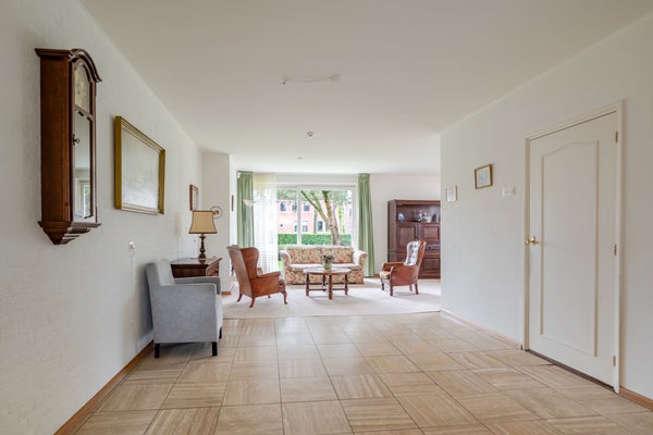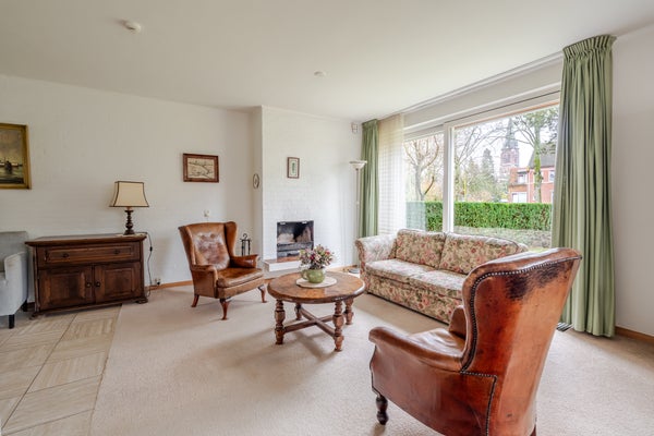 De royale L-vormige woonkamer vormt het hart van de woning. Dankzij de grote raampartijen stroomt het daglicht rijkelijk naar binnen en ontstaat een warme, prettige sfeer. De open haard zorgt voor extra gezelligheid tijdens de koudere maanden.
