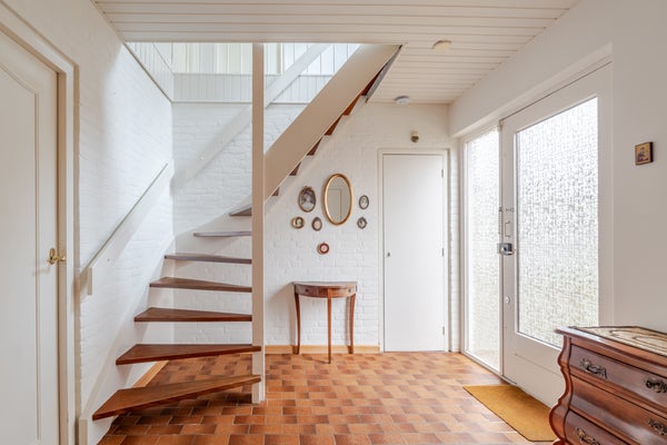 Via de zij-entree kom je in de ruime hal met trapopgang, garderobehoek, meterkast en toilet.