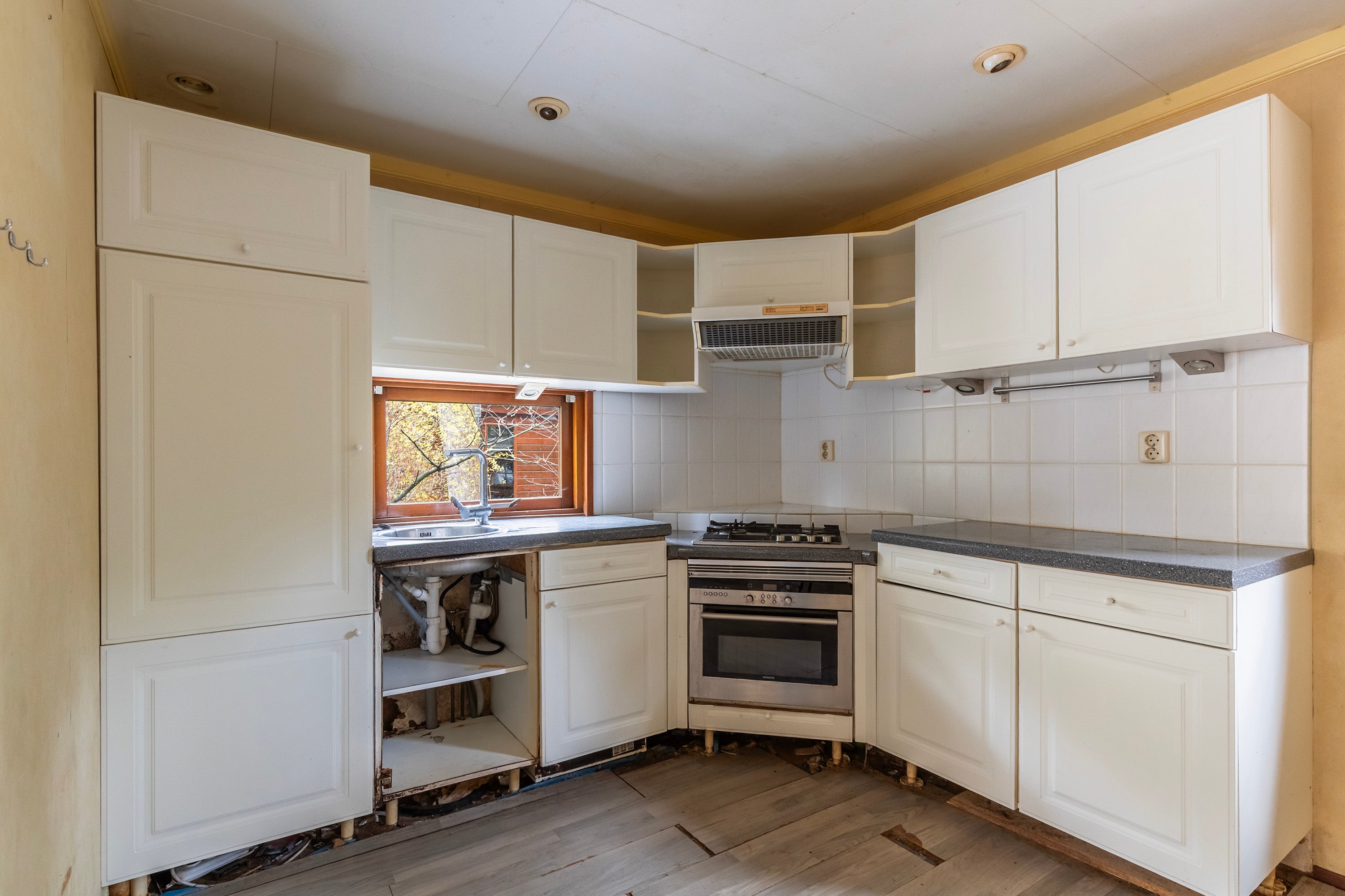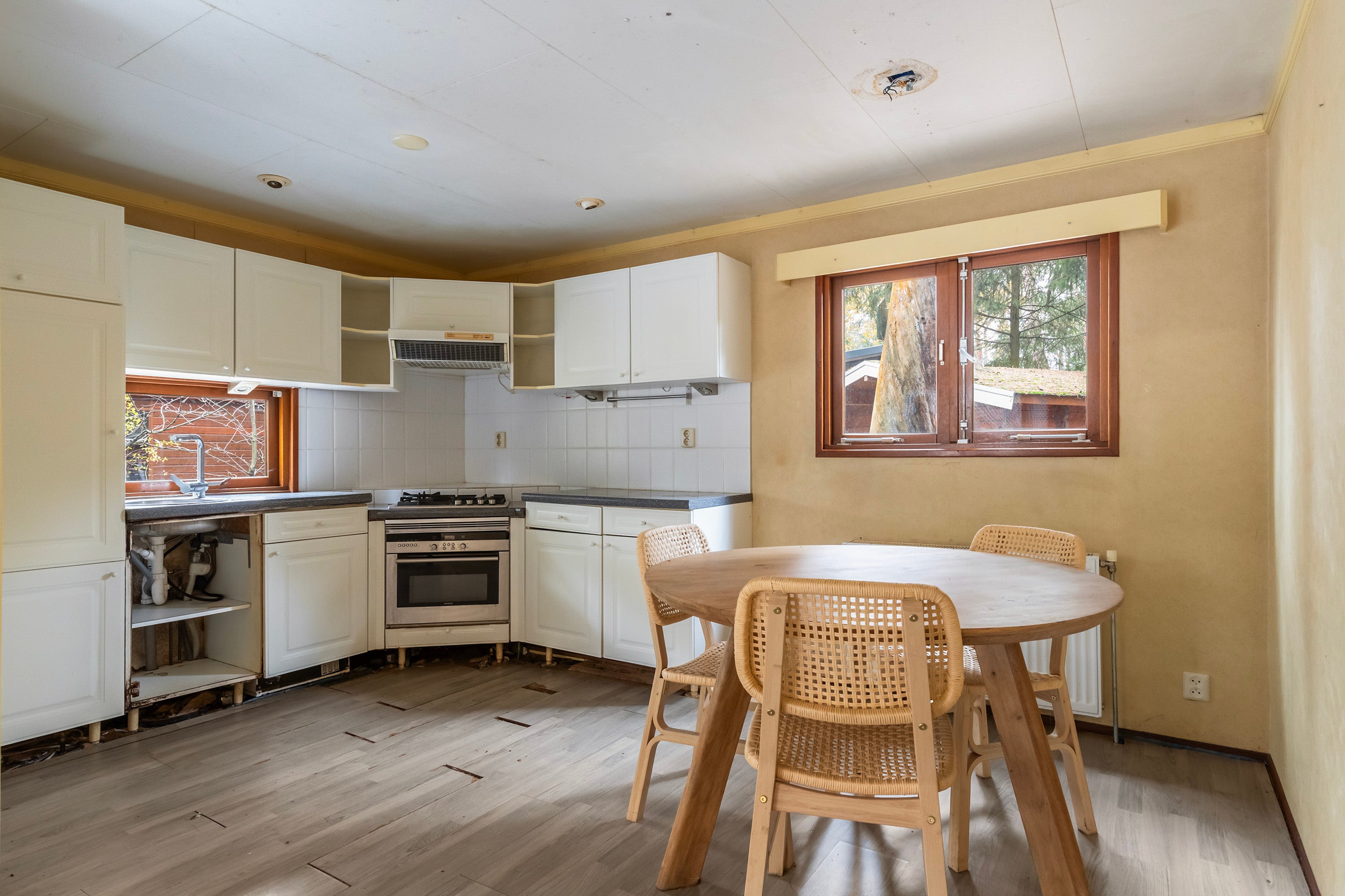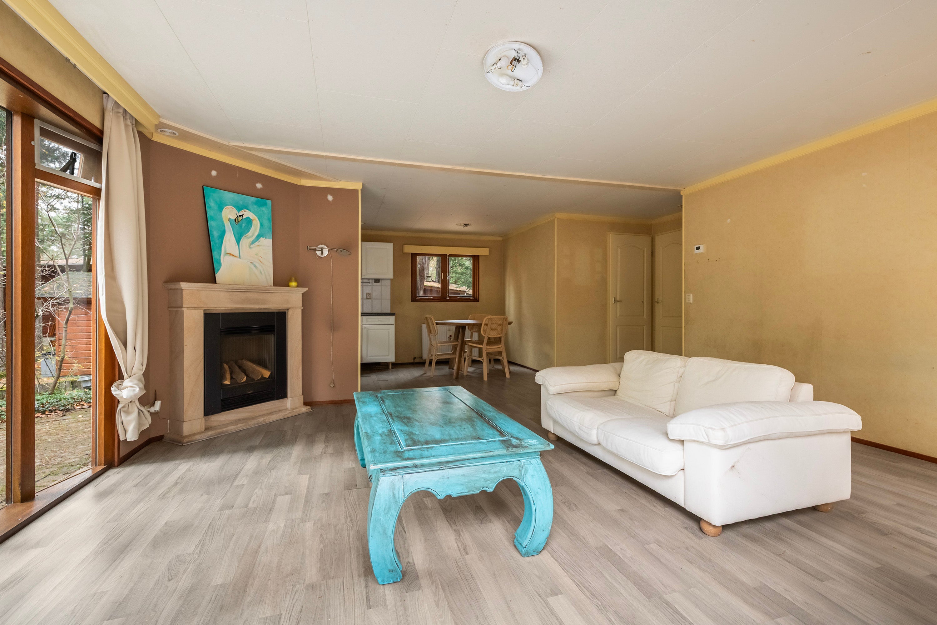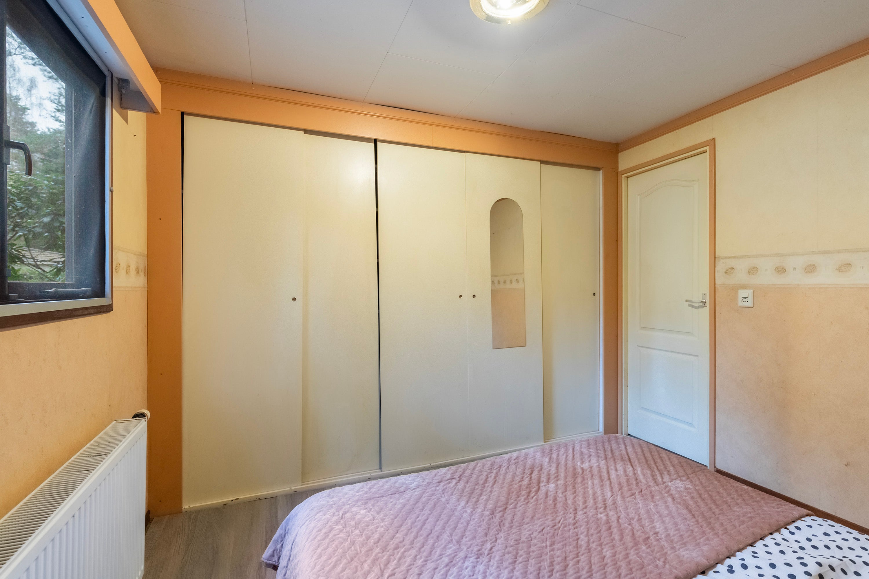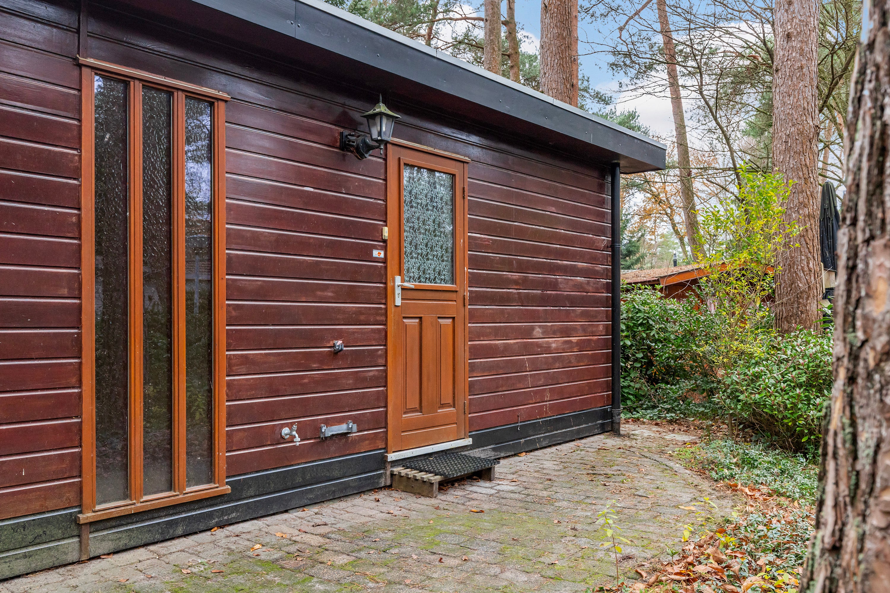 De indeling omvat een entree met hal, badkamer voorzien van douche, toilet en wastafel, een ruime woonkamer met gashaard en openslaande deuren naar de bostuin, en een halfopen keuken. De bungalow heeft 3 slaapkamers en is eenvoudig geïsoleerd (energielabel D) met hardhouten kozijnen en dubbele beglazing. De woonoppervlakte bedraagt 64 m² met 1 woonlaag. De tuin biedt ruimte rondom de woning met een vrijstaande schuur.
