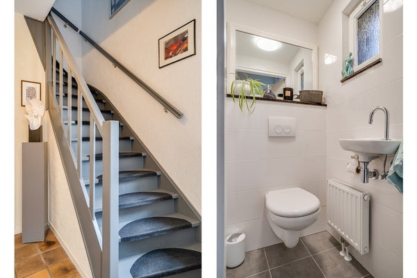 Kom binnen in de langgerekte ontvangsthal waar het toilet, de trapopgang naar de eerste verdieping, de toegang tot de kelder en de woonkamer aanwezig zijn.