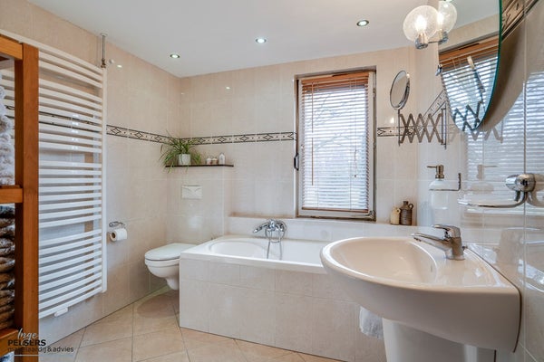 De badkamer is ruim en compleet ingericht met een ligbad, douche, toilet en wastafel. Comfortabel, keurig onderhouden en praktisch voor het hele gezin.