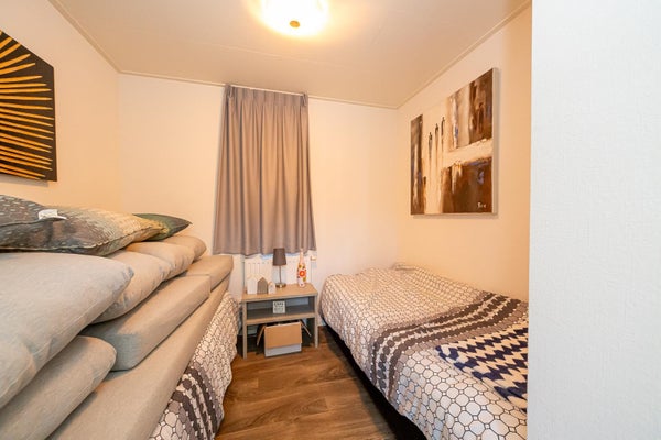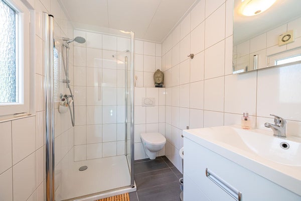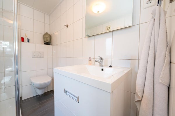 De woning beschikt over twee slaapkamers, beide geschikt voor twee personen en voorzien van kastruimte. De badkamer is praktisch ingericht met een douche en wastafel. Daarnaast is er een separaat toilet aanwezig, wat het comfort voor bewoners en gasten verhoogt.