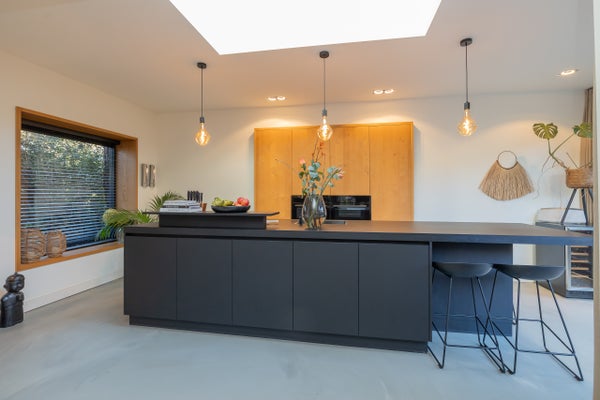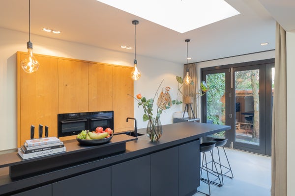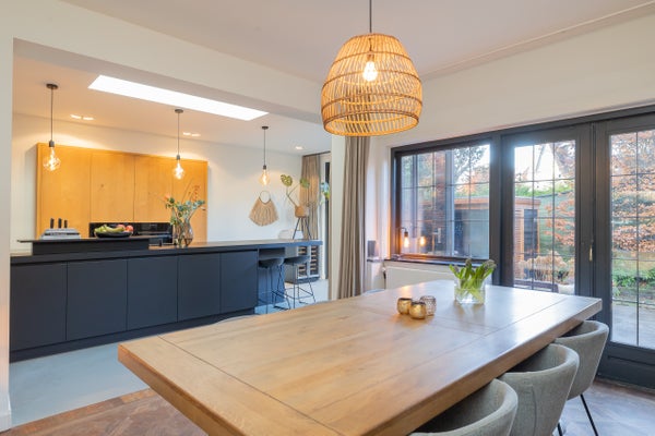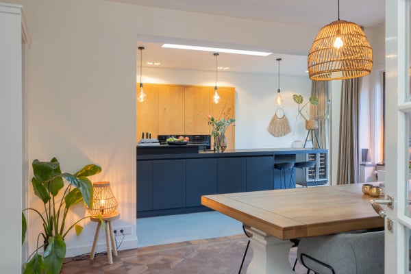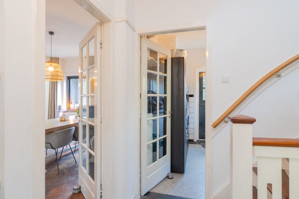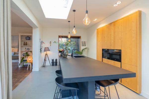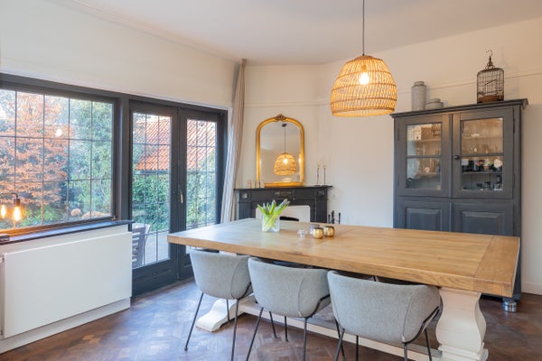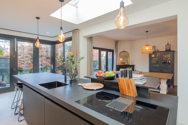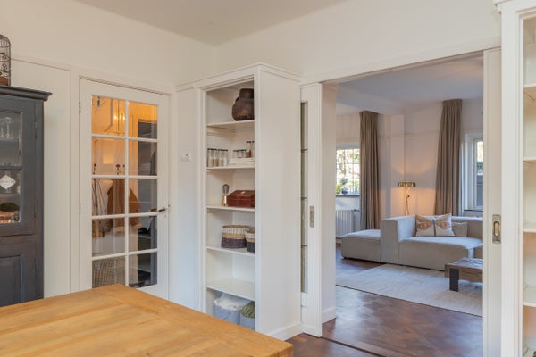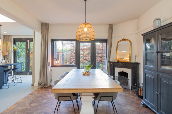 Binnen valt direct de charmante woonkamer-en-suite met stijlvolle suitedeuren op dat geruisloos samenkomt met de prachtige en luxe keuken. Aan de zijkant is de woning namelijk in 2020 uitgebouwd en voorzien van een moderne leefkeuken met kookeiland – hét hart van het huis. Dankzij de lichtstraat en de fraaie harmonicapui naar de tuin is dit een heerlijk lichte plek waar binnen en buiten naadloos in elkaar overlopen. Voor ieder is er wat wils: samen gezellig met het gezin in de living aan de voorzijde of in de keuken, of juist even rustig terugtrekken met een boek of een kop koffie door de suitedeuren te sluiten.