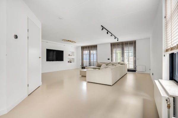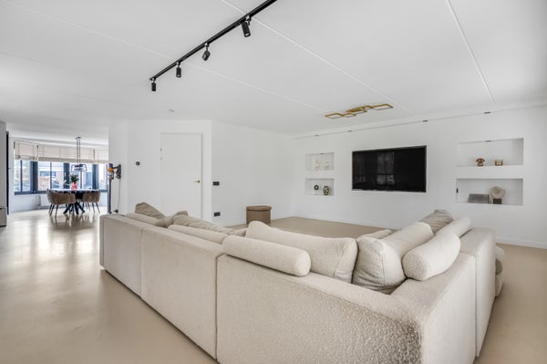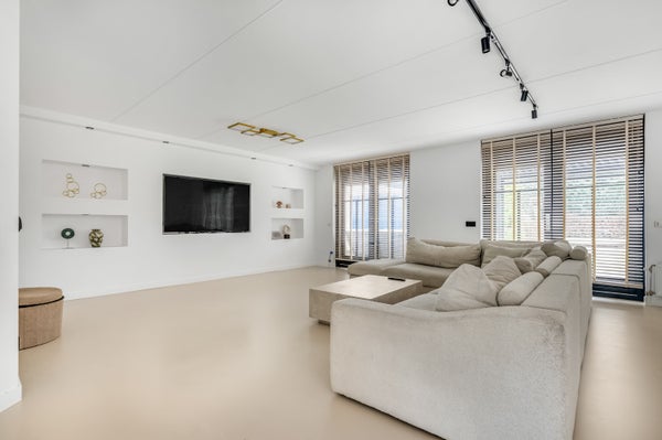 Aan de achterzijde heb je de beschikking over een zeer royale woonkamer, met dubbele deuren naar het overdekte terras en de achtertuin. Blikvanger is de mediawall met inbouwverlichting en genoeg plek voor een grote tv. Ook kun je hier je favoriete kunst en woonaccessoires, in een van de nissen, een mooie plek geven.
