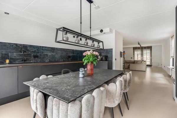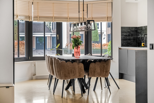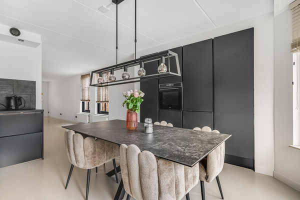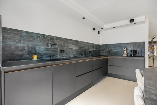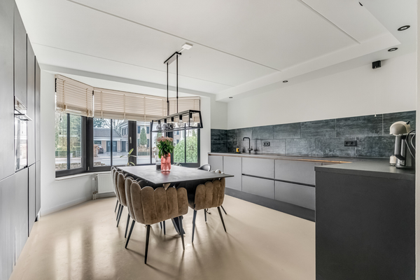 Deze riante woning heeft niet zomaar een keuken, maar een woonkeuken van groot formaat. De erker met ramen zorgt niet alleen voor extra ruimte, maar ook voor de fijne ochtendzon die tot diep in de keuken naar binnen schijnt. De luxe keukenopstelling in een royale L-vorm biedt volop bergruimte, net als de hoge kastenwand. Alle benodigde apparatuur is ingebouwd: een inductie kookplaat met afzuiging, een vaatwasser, combi-oven, koelkast en een vriezer.