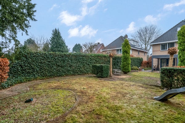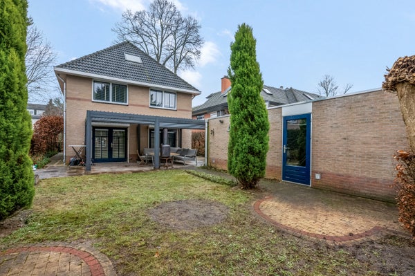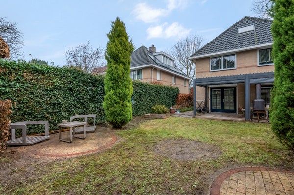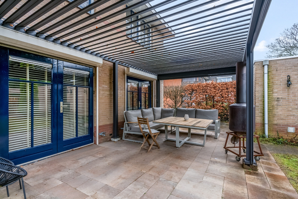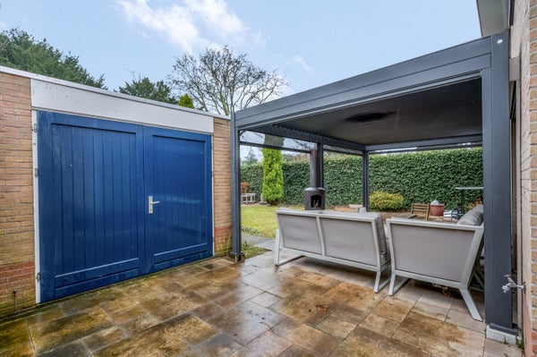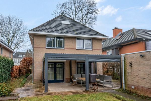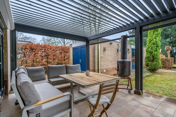 De vrijstaande woning staat op een zeer royaal perceel van maar liefst 655 m2, waarbij de achtertuin op het westen gesitueerd is. Blikvanger is het grote terras met zonnedak, waarvan de wanden gesloten kunnen worden. Dit terras is niet alleen in de zomer te gebruiken, maar een groot deel van het jaar.