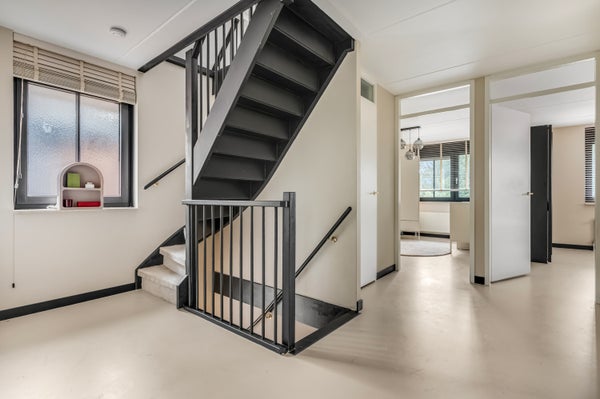 Via de stijlvolle zwarte trap bereiken we de eerste verdieping, waar de overloop wordt verlicht door een groot raam in de zijgevel. Er ligt dezelfde vloer als beneden en er zijn twee inpandige bergingen op deze verdieping, die ook als kleedruimte gebruikt kunnen worden.