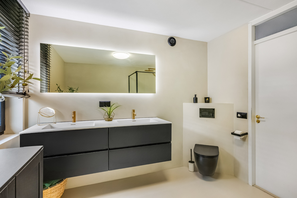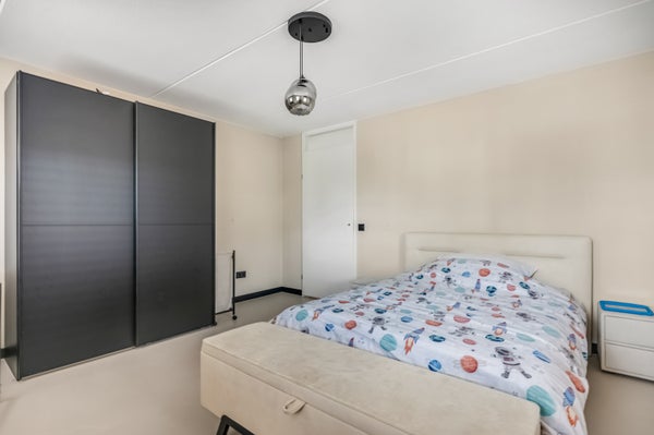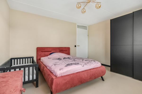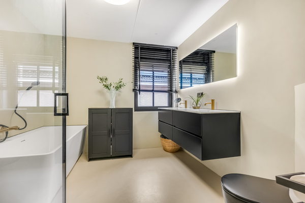 Je vindt hier twee slaapkamers aan de achterzijde, met prachtig uitzicht op de tuin. Een van de kamers is ingericht als kinderkamer, terwijl de andere slaapkamer ruimte genoeg biedt voor een tweepersoonsbed en een garderobekast, vergelijkbaar met de master bedroom aan de voorzijde. De master bedroom, gelegen aan de voorzijde van de woning is prettig ingedeeld. De rustige, warme kleuren creëren een elegante sfeer, waardoor de ruimte direct uitnodigend aanvoelt. Grenzend aan de master bedroom ligt een fraai balkon, bereikbaar via de overloop. De badkamer is fraai uitgevoerd met modern sanitair, in wit en zwart. Het bad is van goed formaat, er is een inloopdouche en aan de andere zijde hangt een breed badmeubel met twee wastafels. Fraaie elementen zijn de kranen, de spiegel met verlichting en het tweede toilet.