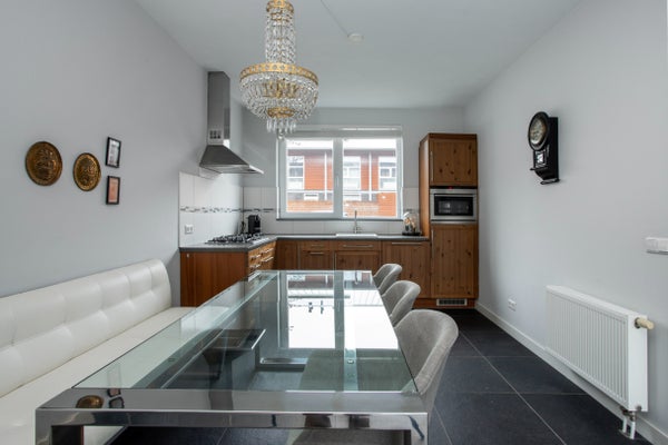 Bij binnenkomst in de ontvangsthal treft u de meterkast, een modern toilet met fonteintje en de trapopgang. De sfeervolle woonkamer geniet van een uitstekende lichtinval en biedt direct toegang tot de achtertuin. De open keuken is van alle gemakken voorzien en beschikt over hoogwaardige inbouwapparatuur, waaronder een 5-pits gasfornuis, combi-oven, vaatwasser en koelkast. De praktische trapkast biedt extra opslagruimte.