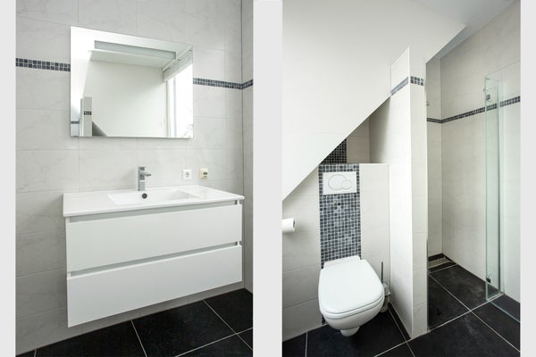 De overloop biedt toegang tot twee ruime slaapkamers, beide voorzien van natuurlijke ventilatie en veel lichtinval door de aanwezigheid van een dakkapel en dakramen. De volledig betegelde badkamer is modern afgewerkt met een inloopdouche, vaste wastafel en tweede toilet. Daarnaast bevindt zich op deze verdieping een technische ruimte met aansluitingen voor witgoed, de CV-opstelling (Nefit, 2010) en de WTW-unit.