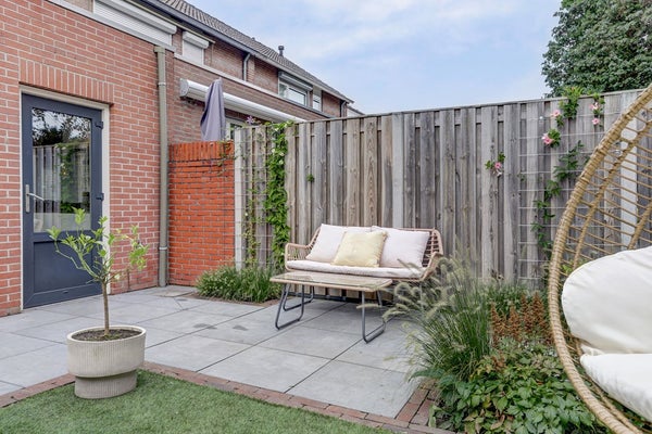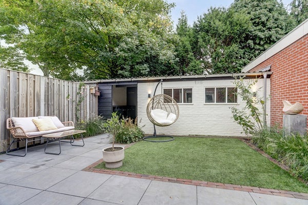 Zodra je naar buiten stapt, valt de rust meteen over je heen. De tuin ligt heerlijk vrij en is speels aangelegd met twee fijne terrassen, een combinatie van tegels en sierbestrating, kunstgras en groene borders met een mooie variatie aan beplanting. De omheining van stenen muren en houten schuttingdelen zorgt voor privacy en een beschut gevoel.