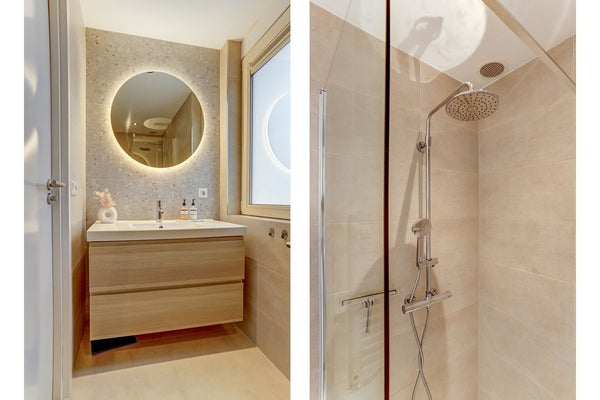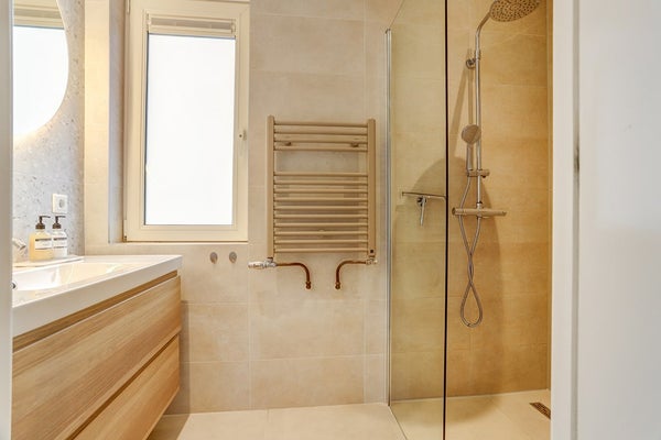 Deze badkamer kreeg in 2022 een complete make-over en dat merk je meteen: strak, modern en fris. Aan de rechterzijde vind je een royale inloopdouche met zowel een hand- als regendouche, deels gescheiden door een glazen wand. Hier begin je de dag ontspannen of sluit je ’m relaxt af.