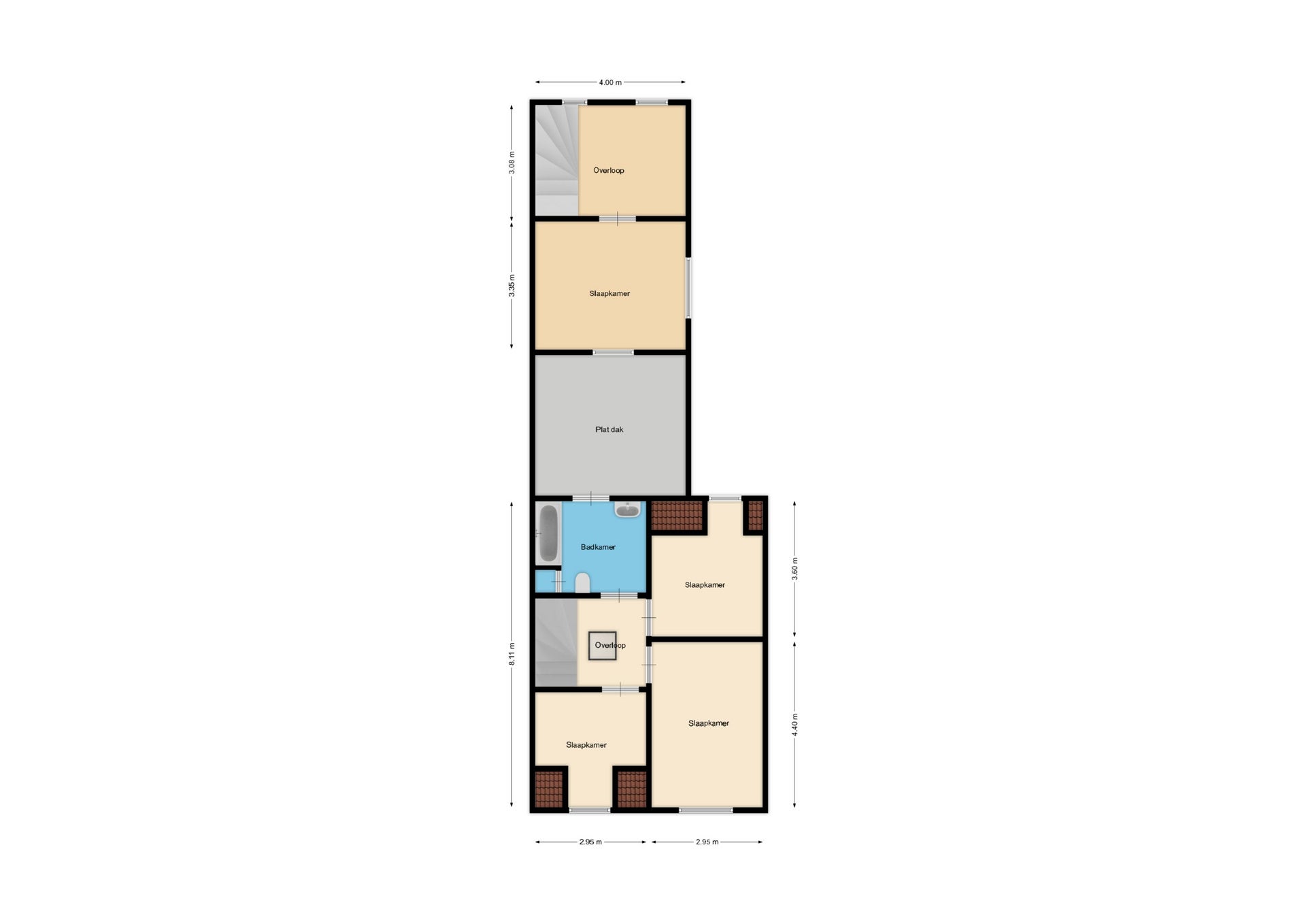- De tussenwoning heeft een woonoppervlakte van 245 m² en beschikt over 10 kamers, waarvan 8 slaapkamers;