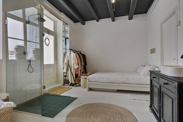 Slaapkamer 1 is afgewerkt met een houten vloer, gestucte wanden en een houten balken plafond. De slaapkamer is voorzien van een douche, wastafel, aansluiting voor wasmachine- en droger en biedt toegang tot de heerlijke stadstuin.