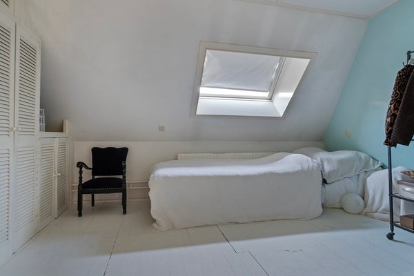 Slaapkamer 2 is afgewerkt met een houten vloer, gestucte wanden en plafondplaten. De slaapkamer is voorzien van een dakraam.