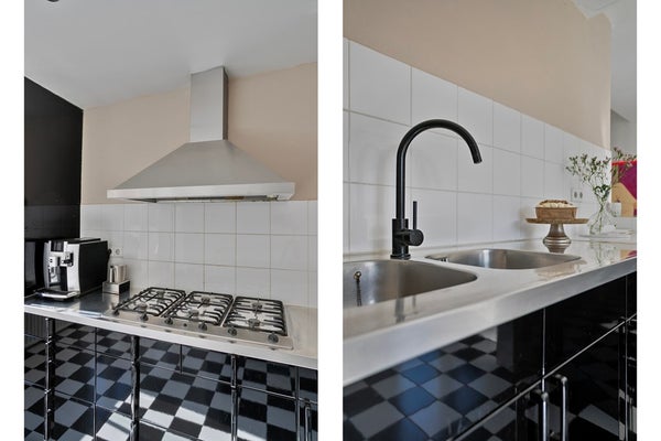 De open keuken is afgewerkt met een betegelede vloer, gestucte wanden en een gestuct plafond met inbouwverlichting. De in U-opgestelde keukeninrichting is voorzien van een 5-pits gasfornuis met wokbrander, afzuigkap, oven, dubbele spoelbak en onder kastjes. Hier kunnen jullie heerlijke recepten bereiden! De keuken biedt toegang tot het balkon. Geniet op het balkon van een adembenemend uitzicht op de iconische Peperbus van Bergen op Zoom.