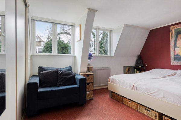 De extra grote slaapkamer kan eenvoudig terug worden opgesplitst in twee kamers. De hoofdslaapkamer blijft dan nog steeds prima van formaat. Het dakkapel zorgt voor het nodige daglicht in de kamer. In de kastenwand kun je flinke garderobe in kwijt.