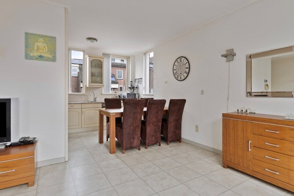 De woonkamer is gelegen aan de achterzijde van de woning, is tuingericht en heeft een open keuken met in hoek opgestelde keukeninrichting. Middels een schuifpui is er toegang tot de achtertuin.
