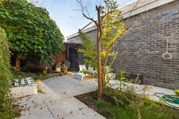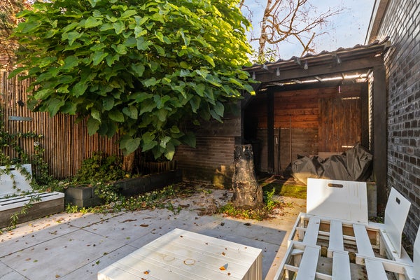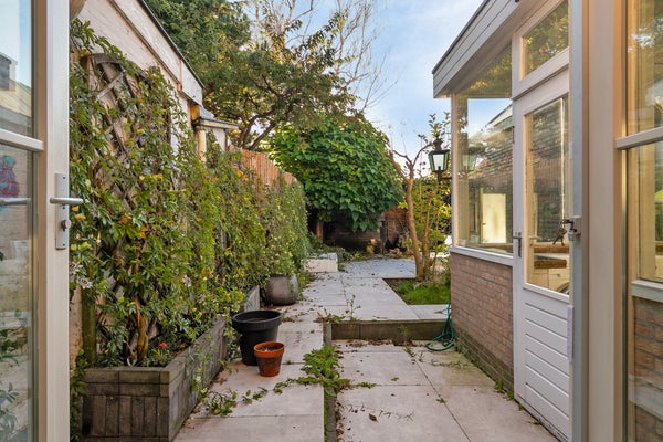 Heerlijke beschutte, zonnige tuin met mooie verhouding tussen groen en tegels, gelegen op het Zuid-Oosten met overkapping aan het einde van de tuin