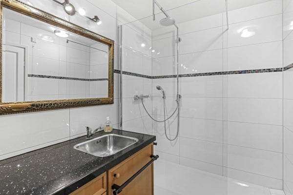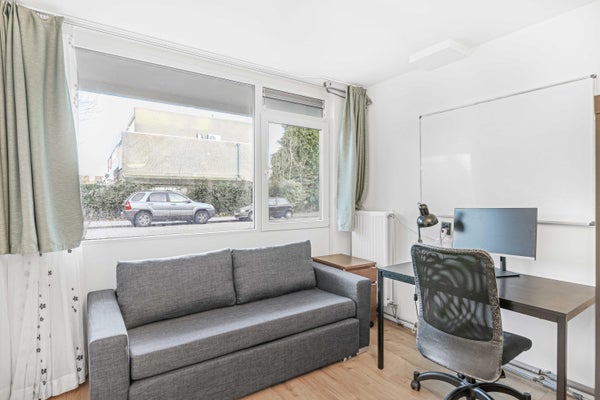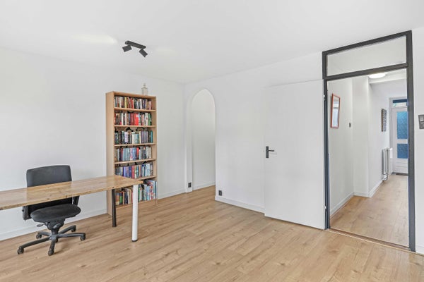 Aan de andere kant van de woonkamer vind je een gang die toegang geeft tot de eerste slaapkamer/werkruimte van ca. 11 m² met veel lichtinval, en de badkamer van 5 m², voorzien van een douche, toilet en wastafel met meubel.
