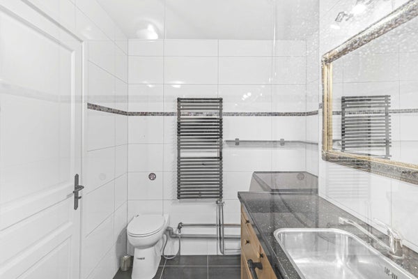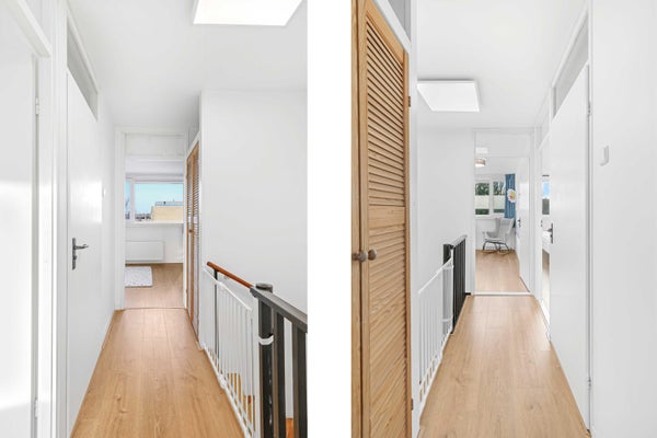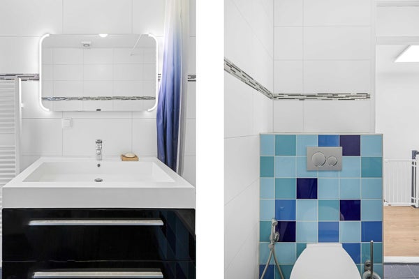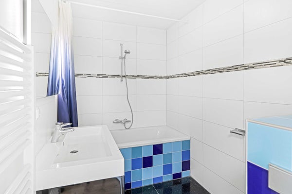 De trap in de overloop leidt naar de tweede verdieping, waar drie ruime slaapkamers en de tweede badkamer van ca. 5 m² te vinden zijn. Ook deze badkamer is uitgerust met een bad/douchecombinatie, wastafel en wastafelmeubel, ideaal voor gezinnen of gasten.