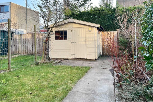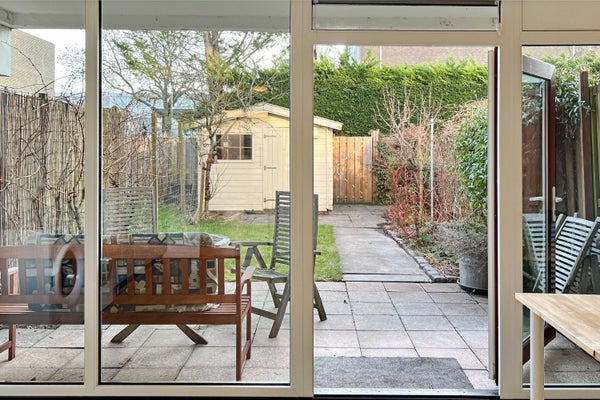 Je komt de woning binnen in de hal, waar zich de meterkast en een praktische bergingkast bevinden. Via de hal bereik je de woonkamer van circa 19 m², die toegang geeft tot de zonnige achtertuin van circa 58 m² op het zuiden. In de tuin staat een vrijstaand tuinhuis van 6 m², voorzien van elektra, ideaal voor opslag of als werk-/hobbyruimte.