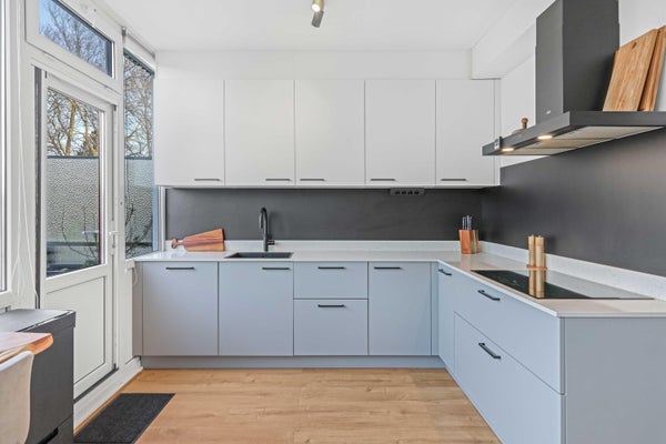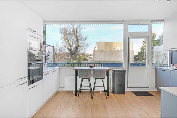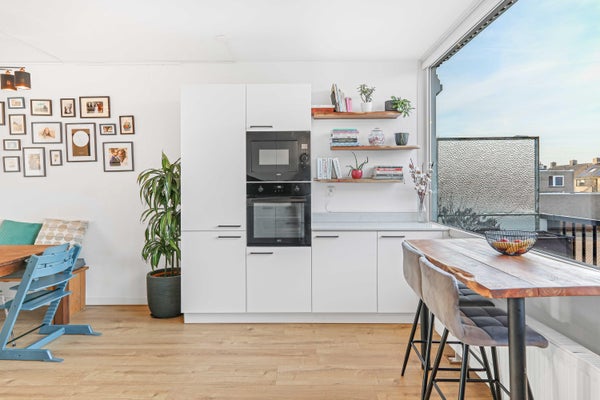 Daarnaast bevindt zich op deze verdieping de ruime keuken, volledig uitgerust met inbouwapparatuur. Vanuit de keuken is er toegang tot een tweede balkon van ca. 6 m² op het noorden – een fijne plek om te ontspannen of buiten te eten.