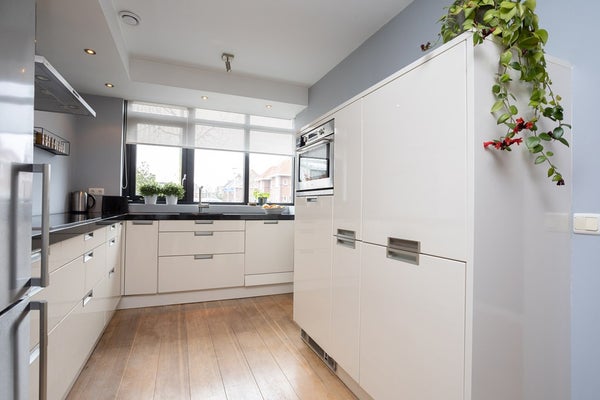 Entree, ruime hal met meterkast, trapopgang, toilet met fonteintje en deur naar de ruime living. Bij binnenkomst vallen direct de grote ramen op; heerlijk al dat licht. Let ook op het plafond; deze is strak gestuukt. Aan de voorzijde is de open keuken, deze beschikt over een inductiekookplaat, koelkast, vaatwasser en een oven. Het geheel is afgewerkt met een mooi zwart composiet blad. De volledige begane grond is voorzien van lamel parket.