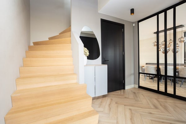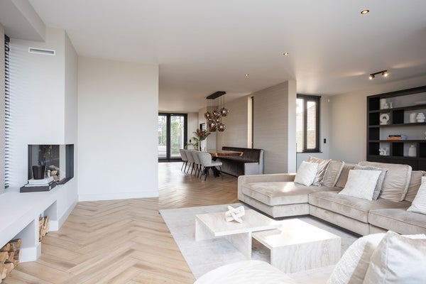 Entree, ruime hal met meterkast, garderobe luxe toilet met fonteintje en trapopgang naar de 1e verdieping. Deur naar de riante living met aan de voorzijde de woonkamer, wat direct opvalt zijn de prachtige raampartijen. Heerlijk al dat licht. Let ook op de wanden en plafond, deze zijn strak gestuukt. Op de vloer prachtig PVC in visgraat motief. De sfeervolle gashaard maakt het af. Aan de achterzijde is de royale open keuken met eiland. Dit is een prettige plek om te verblijven, van alle gemakken voorzien, strak en in een moderne stijl afgewerkt. De keuken is voorzien van een Quooker, stoomoven, oven, wijnklimaatkast, vaatwasser koelkast en een vriezer. Vanuit de keuken toegang tot de inpandige geïsoleerde garage met elektrische deur en openslaande deuren.