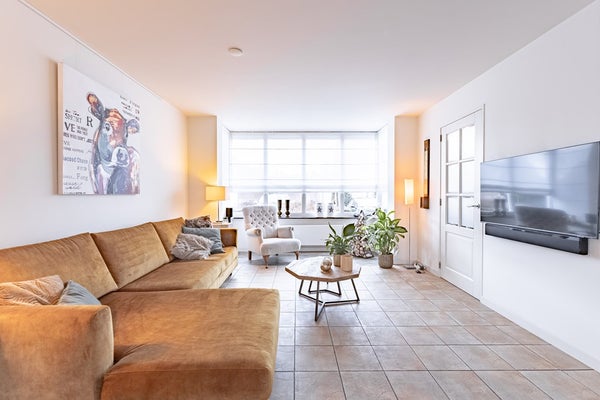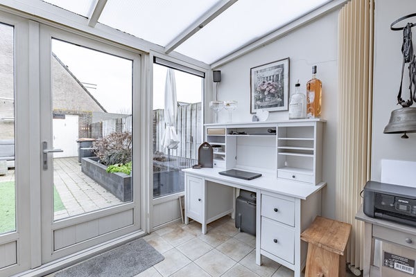 De woonkamer is aan de voorzijde uitgebouwd met een erker en loopt door naar de open keuken en de serre aan de achterzijde. De serre is voorzien van tuindeuren en vormt een fijne, lichte verlenging van de woonruimte.