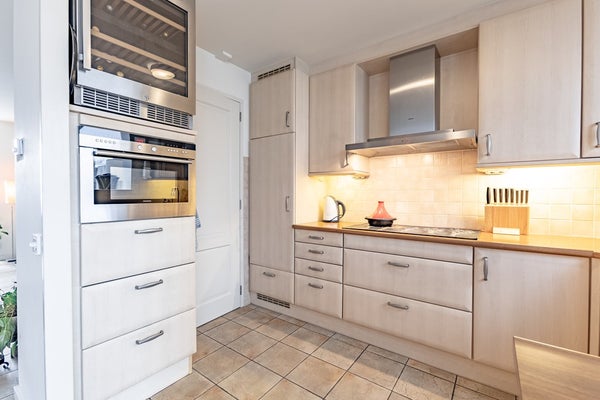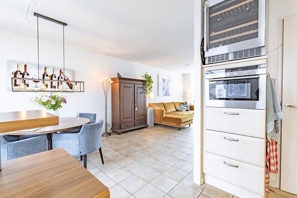 De keuken is gesitueerd aan de achterzijde en uitgevoerd in een praktische hoekopstelling. Deze is voorzien van alle gewenste inbouwapparatuur, waaronder een vaatwasser, inductiekookplaat, afzuigkap en koelkast. Daarnaast is er een handige voorraadkast onder de trap.