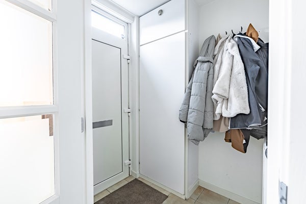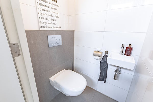 Entree met hal, meterkast, toiletruimte en toegang tot de woonkamer. Het toilet is volledig betegeld en voorzien van een wandcloset en fonteintje.