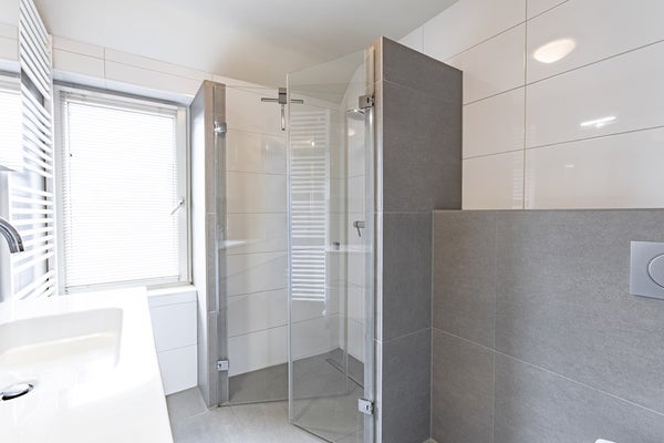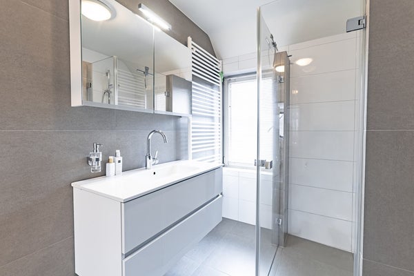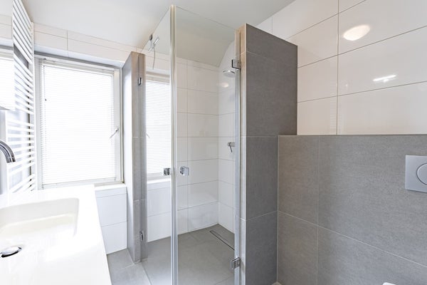 uitgevoerd in dezelfde stijl als het toilet beneden en beschikt over een inloopdouche met deuren, wandcloset, handdoekenradiator en een extra brede wastafel met meubel.