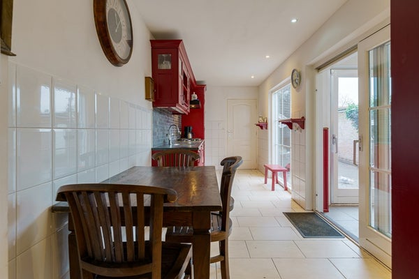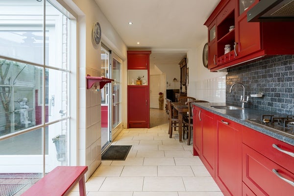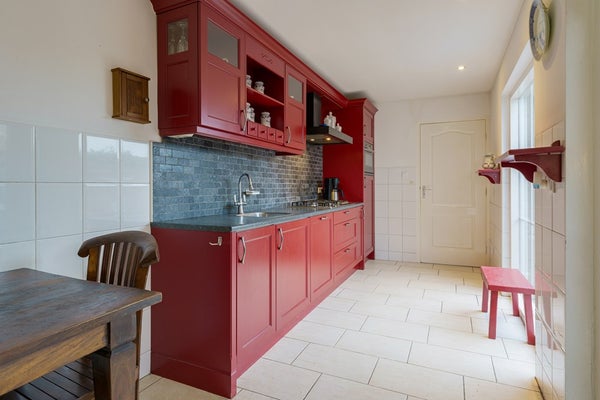 Loop je de keuken uit, dan kom je aan de achterzijde in een klein halletje met aan de rechterkant het toilet. Vanuit de keuken bereik je ook de serre, via een schuifpui ideaal als extra zit plek om het hele jaar door van het buitengevoel te genieten.