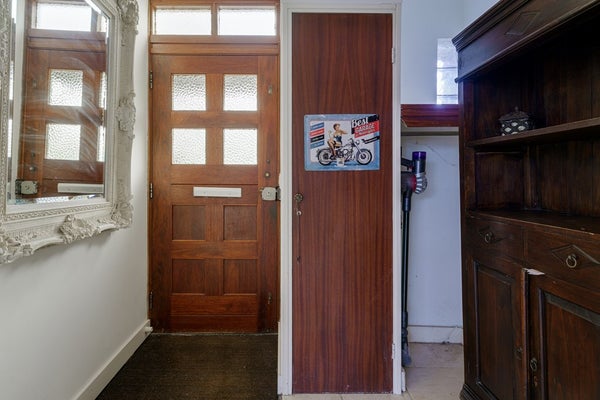 Je komt binnen vanuit de voortuin in de ruime entree. Links vind je direct de meterkast. Loop je verder door, dan zit links de trapopgang naar de eerste verdieping. Aan de rechterkant stap je de ruime woonkamer binnen.