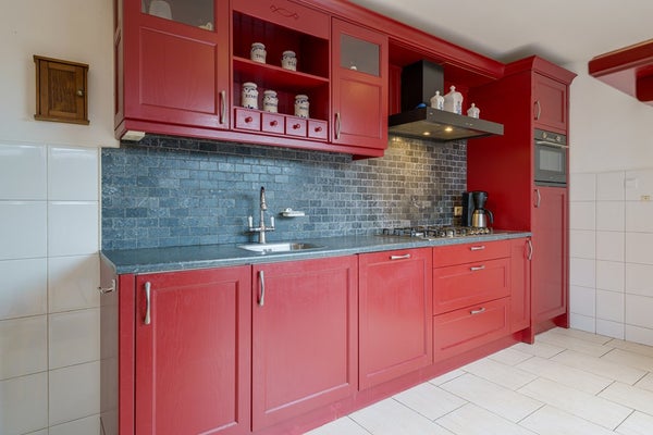 Wanneer je verder naar achteren loopt in de woonkamer, kom je uiteindelijk uit bij de halfopen keuken. De keuken is uitgerust met een vaatwasser, gasfornuis, keramische kookplaat, magnetron, combioven, wastafel met kraan en een afzuigkap.
