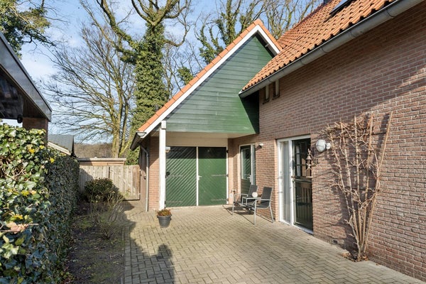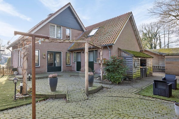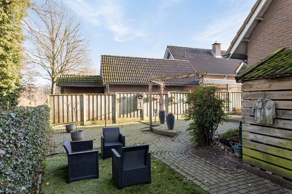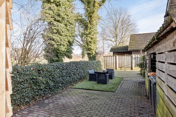 De ruime tuin biedt een mooie balans tussen bestrating en groen. Het vrije en prachtige uitzicht over het achtergelegen weiland zorgt voor een gevoel van rust en ruimte, een heerlijke plek om te ontspannen en te genieten van het buitenleven.