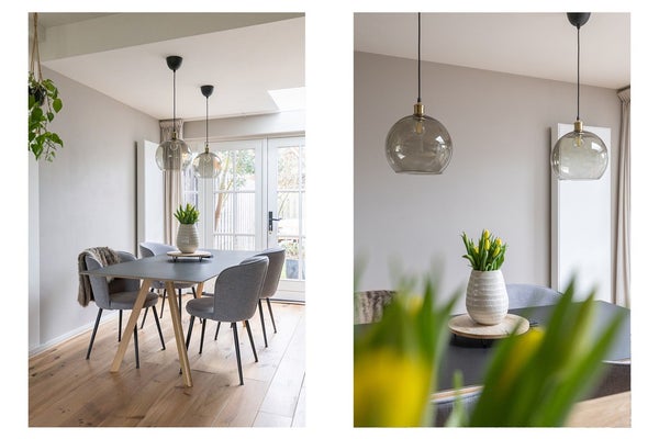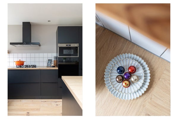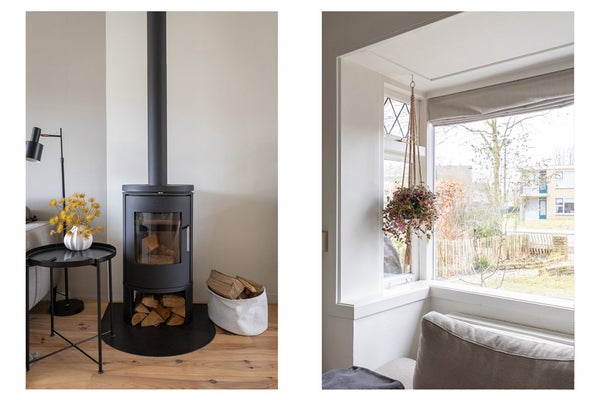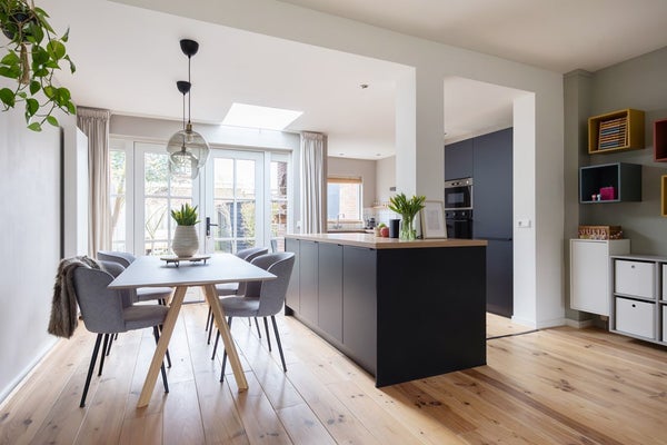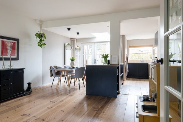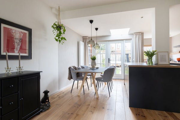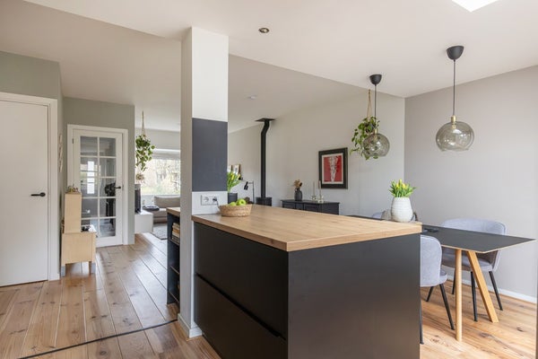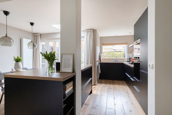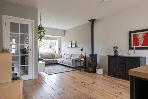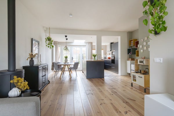 De sfeervolle woonkamer heeft verschillende hoekjes, de erker aan de voorzijde geeft veel lichtinval en kijkt uit op de voortuin. De houtkachel zorgt voor aangename warmte in de wintermaanden en de grote bergkast onder de trap biedt veel praktische opbergruimte. Het eetkamergedeelte ligt aan de achterzijde en heeft openslaande deuren naar de tuin. De moderne open keuken in hoekopstelling en groot eiland voor extra werk- en kastruimte is voorzien van alle moderne apparatuur.