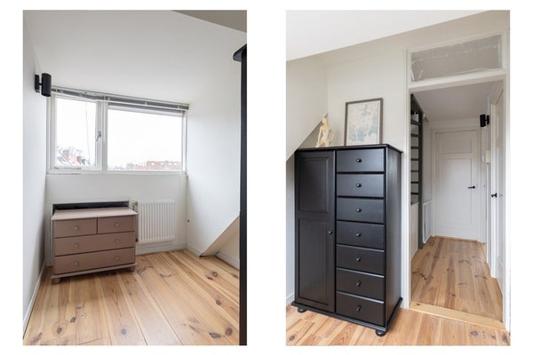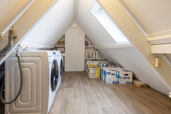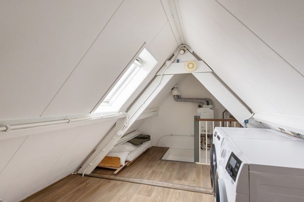 De zolder is bereikbaar via een vaste trap en biedt plaats aan de wasmachine en droger, de CV-ketel en veel bergruimte. Het is toegestaan om dakkapellen te plaatsen om een extra kamer te creëeren.