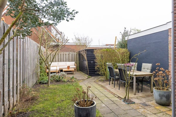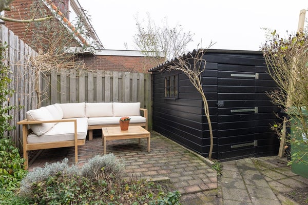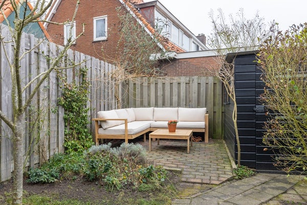 De beschutte achtertuin is gelegen op het oosten en heeft diverse terrassen om op verschillende momenten van de dag te genieten van de zon of juist de schaduw. Achter in de tuin staat een houten schuur met deur naar de achterom. De diepe voortuin is gelegen op het westen en biedt eveneens ruimte om te zitten en voor bijvoorbeeld een kinderspeeltoestel.