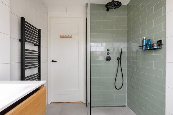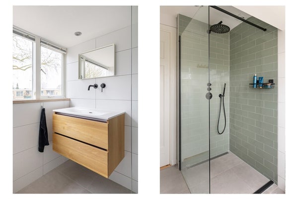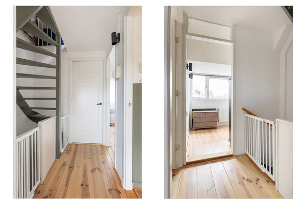 De overloop biedt toegang tot de drie slaapkamers en de moderne badkamer met inloopdouche, wastafelmeubel en toilet.