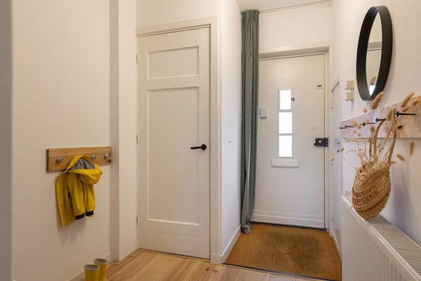 Entree, hal met trap naar de eerste verdieping, meterkast, modern zwevend toilet en toegang tot de woonkamer en keuken.