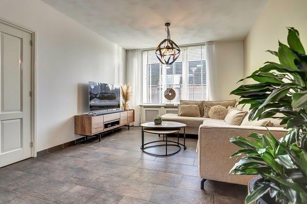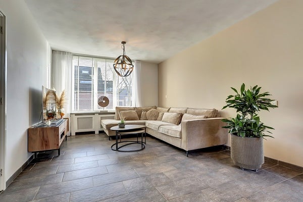 Aan de voorzijde van de woning ligt de sfeervolle woonkamer, een fijne, lichte leefruimte waar je meteen ziet hoe keurig alles is onderhouden. Strak gestucte wanden worden hier mooi gecombineerd met warme zandtinten wat zorgt voor een rustige, moderne uitstraling en een prettige balans. Het grote raam aan de voorzijde laat volop daglicht binnenstromen waardoor de ruimte heerlijk licht en uitnodigend aanvoelt.