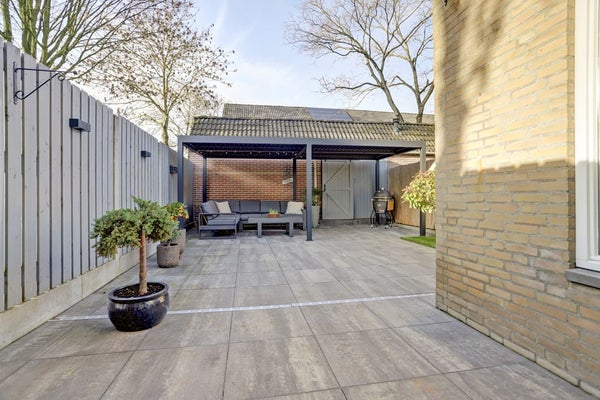 Een groot pluspunt is de nette overkapping: ideaal om in te richten als gezellige loungehoek, een perfecte plek om in de zomermaanden te genieten van zon, een goed boek of een borrel met vrienden.